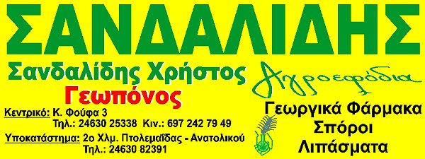 Aρχική 29 Οκτωβρίου 2016 ΣΑΝΔΑΛΙΔΗΣ ΓΕΩΡΓΙΚΑ ΕΦΟΔΙΑ ΠΤΟΛΕΜΑΪΔΑ Εκτύπωση ΣΑΝΔΑΛΙΔΗΣ ΓΕΩΡΓΙΚΑ ΕΦΟΔΙΑ ΠΤΟΛΕΜΑΪΔΑ Σανδαλίδης Χρήστος Γεωπόνος Γεωργικά Φάρμακα - Σπόροι - Λιπάσματα Κεντρικό : Κ. Φούφα 3 Τηλ.: 24630 25338 Υποκατάστημα: 2ο Χλμ. Πτολεμαϊδας - Ανατολικού Τηλ.: 24630 82391 Εμφανίσεις: 12223